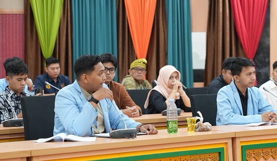 Badan Eksekutif Mahasiswa (BEM) Universitas Riau menggelar audiensi dengan DPRD Provinsi Riau dengan membawa sejumlah simbol sumber daya alam, seperti minyak bumi, minyak goreng, dan brondol sawit, Jumat (13/3/2026).